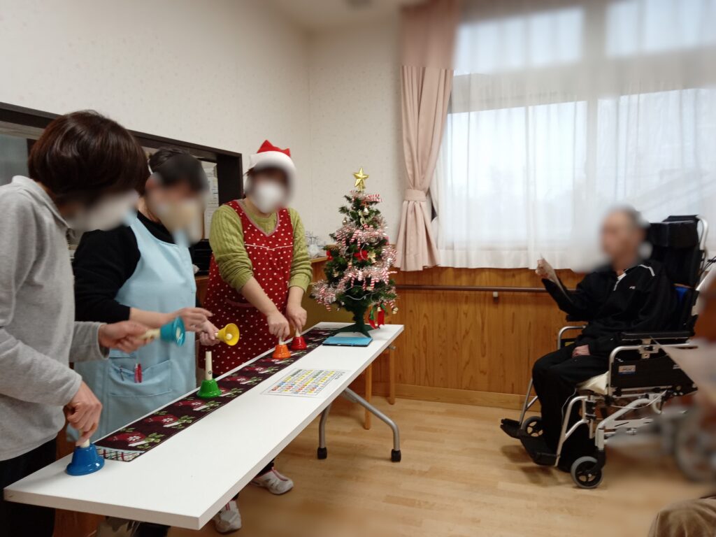 今年もユニット毎に開催。入居者様も参加して、ハンドベル演奏会を行いました。