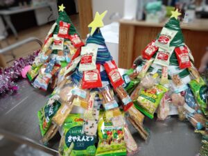 おかしツリーを作成し、好きなお菓子を皆様に選んでもらい、クリスマスプレゼントにしました。